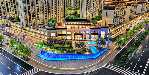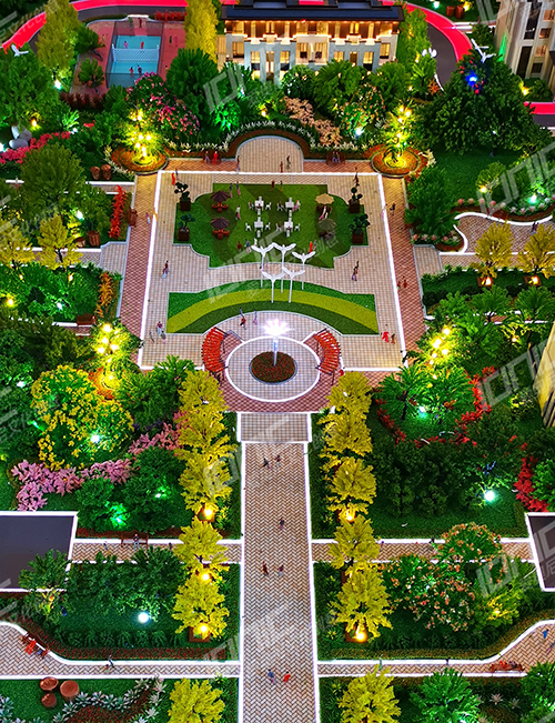 小區(qū)內(nèi)部景觀遵循五重綠化工藝設(shè)計(jì),不同的場景布置不同的樹種,各色各樣的綠植,高低錯(cuò)落,非常有層次感。水面采用仿真水制作,路面采用UV打印制作,使得鋪裝逼真,色彩素雅,映襯沙盤更加閃耀奪目。