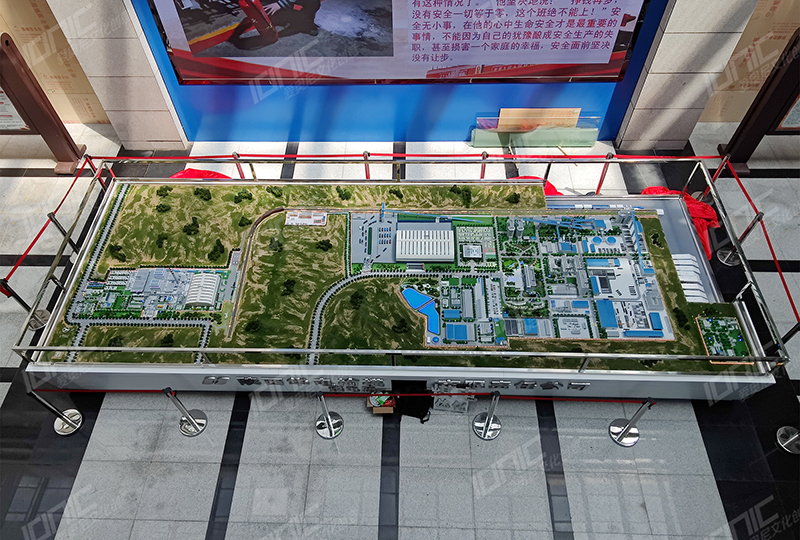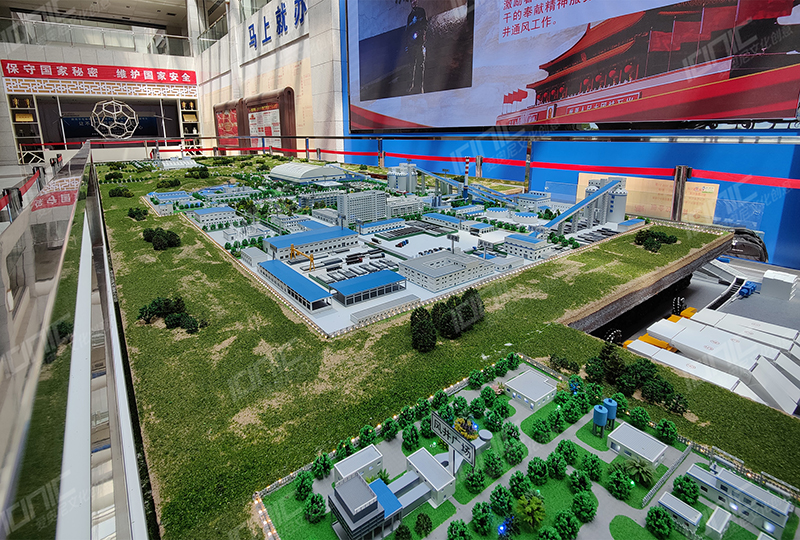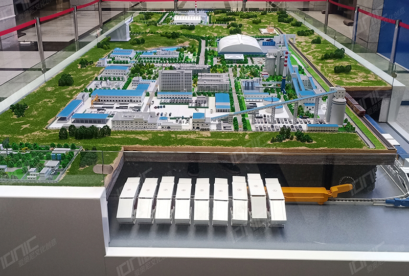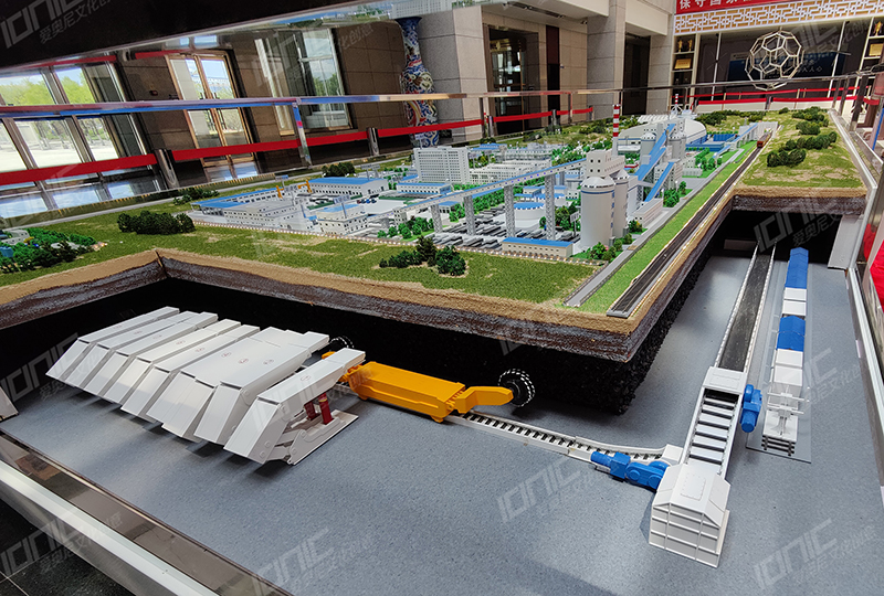 針對榆橫煤電一體化項目,愛奧尼采用園區(qū)整體寫實制作,建筑、景觀以燈光裝飾;主參觀面以刨切形式,展示地下開采場景。開采設(shè)備高仿真寫實制作,并加入流程燈和輪廓燈重點突出。為了展現(xiàn)模型的科技感,火車及軌道適度放大制作,火車沿著軌道模仿實際運行。